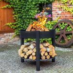 De houtopslag onder de vuurschaal bestaat uit een stalen plaat waar hout op gelegd kan worden. Door de praktische houtopslag onder vuurschaal pak je direct een extra stuk hout en houd je het vuur aan of maak je het vuur groter. Omdat de vuurschaal hoger op de poten staat dan de meeste vuurschalen kun je deze vuurschaal eenvoudig aanvullen met hout.