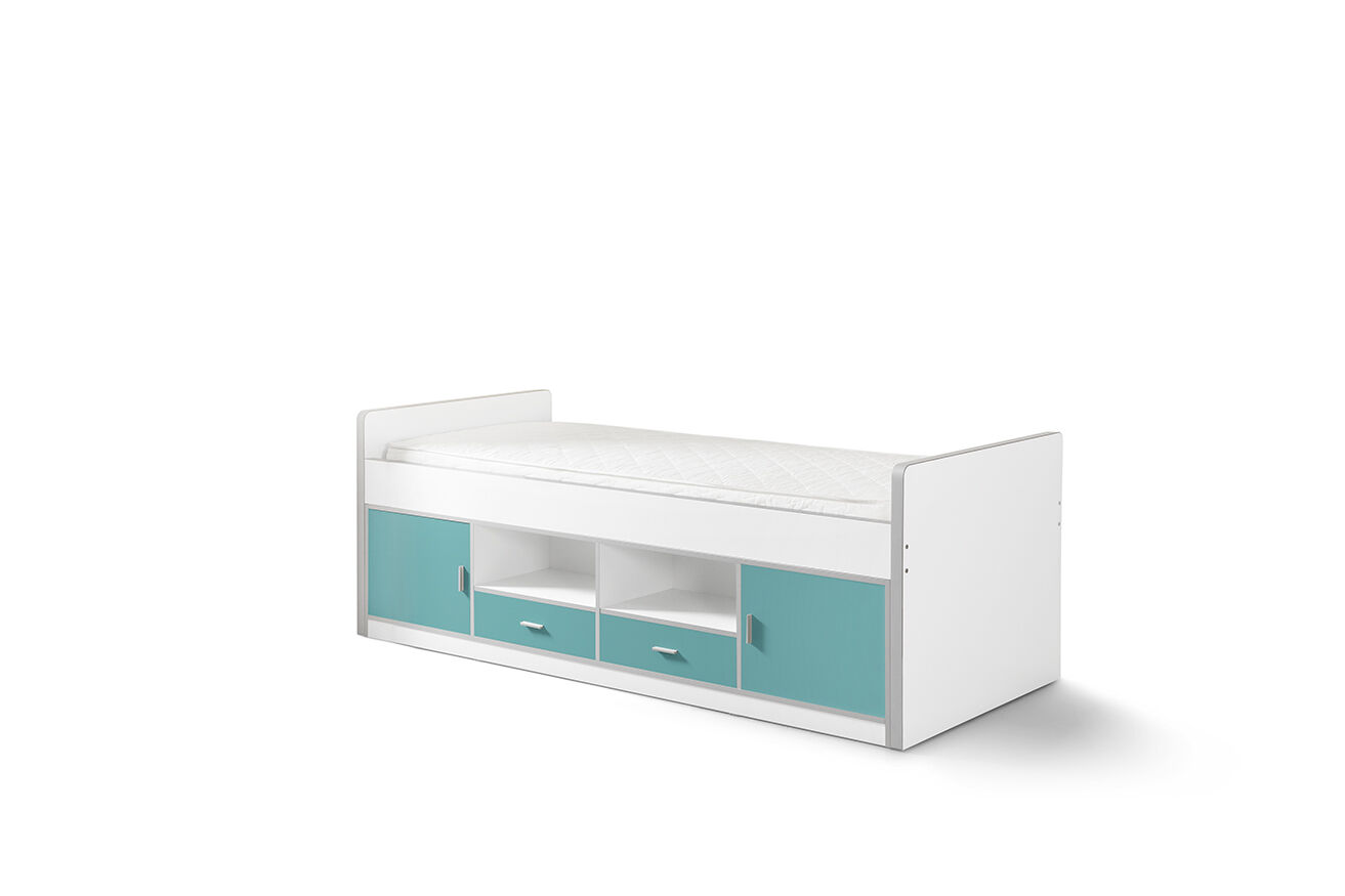 Eigenschappen van deze bonny-combinatie bestaat uit het turquoise kajuitbed met de bijhorende lattenbodem.