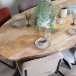 Twijfel je tussen een rechthoekige en een ronde eettafel? Ga voor ovaal! Een ovalen eettafel heeft met zijn rondingen en ruim aantal zitplekken het beste van beide vormen gecombineerd. De voordelen van een ovale tafel Een ovale eettafel met spinpoot is net even unieker, speelser en zachter dan een strakke, rechthoekige tafel in de keuken of eetkamer. Daarnaast is het een ideale vorm voor kleinere ruimtes: de tafel heeft geen hoeken en daardoor kun je makkelijk rondom de eettafel bewegen. Ook fijn met kleine kinderen. Een ander voordeel van de ovale tafel is dat je alle tafelgenoten beter kunt aankijken. Dat maakt tafelen een stuk gezelliger. Omdat het metalen onderstel in het midden is bevestigt, heb je geen last van ruimte gebrek aan de uiteinden van het mangohouten tafelblad. Een extra plek aan tafel creëren? Je schuift er zo een stoel bij! Dit is handig om mee te nemen bij je beslissing: de breedte van de eetkamerstoelen heeft invloed op de hoeveelheid stoelen die je kwijt kunt aan de ovalen tafel. Voor de meeste eetkamerstoelen geldt dit handige lijstje: – Bij de afmeting 180 x 90 cm is er plaats voor 6 personen. – Bij de afmeting 200 x 100 cm is er plaats voor 6-8 personen. – Bij de afmeting 220 x 100 cm is er plaats voor 8 personen. – Bij de afmeting 240 x 110 cm is er plaats voor 8-10 personen. – Bij de afmeting 260 x 120 cm is er plaats voor 10 personen. – Bij de afmeting 300 x 120 cm is er plaats voor 10-12 personen. OnderhoudMangohout heeft in het algemeen weinig onderhoud nodig en is behandeld tegen vocht en vlekken. Wij geven echter geen garantie op het eventueel ontstaan van oneffenheden. Om beschadigingen, vlekken en kringen te voorkomen, raden wij aan om onderzetters en/of viltjes te gebruiken. Het mangohout is afgewerkt met een beschermlaag. Om het hout te beschermen én mooi en levendig te houden raden wij aan om het hout 2 tot 4 keer per jaar te behandelen met Elite Polish.