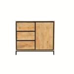 Kabinet kast RichWood is uitgevoerd in gelakt mangohout in combinatie met een zwart gelakt metalen frame. Dit model is voorzien van een deur en drie lades. Het kabinet is ingelegd met verschillende stroken hout, waar het meubel zijn eigentijdse karakter aan te danken heeft.