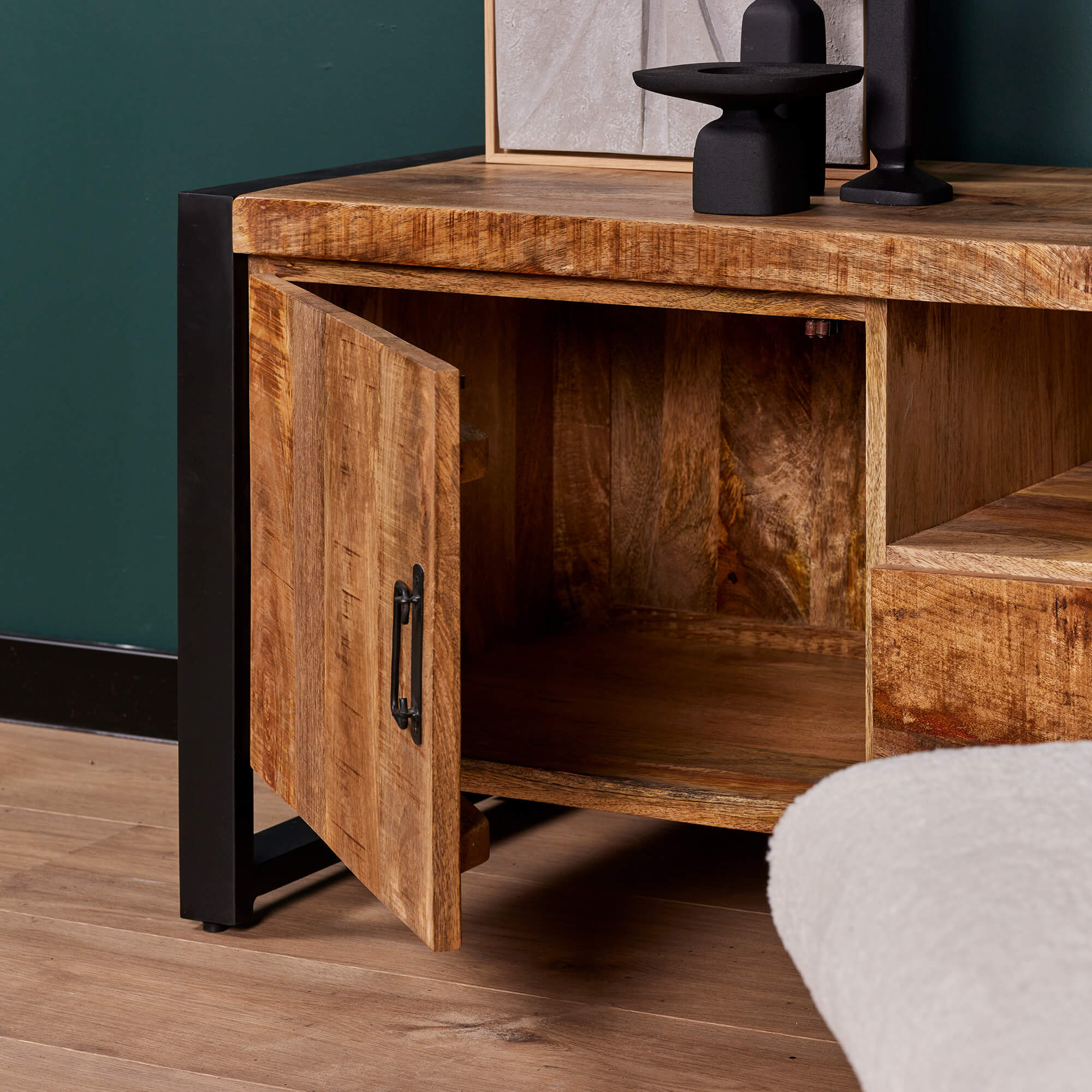 Dit tv meubel komt uit onze Boaz serie en heeft één deur en open vak. De kast is uitgevoerd in massief mangohout en metaal. Het mangohout is behandeld met een beschermlaag. Het frame en de handgrepen zijn afgewerkt met een zwarte lak.