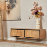 Het zwevende tv meubel RichWood is een verfijnd staaltje vakmanschap, uitgevoerd in gelakt mangohout gecombineerd met een zwart gelakt metalen frame. Dit stijlvolle tv meubel beschikt over twee greeploze deuren, wat zorgt voor een strakke en moderne uitstraling. De ingelegde houten stroken geven het meubel zijn unieke en eigentijdse karakter. Het zwevende RichWood tv-meubel maakt deel uit van de Starfurn woonserie RichWood.